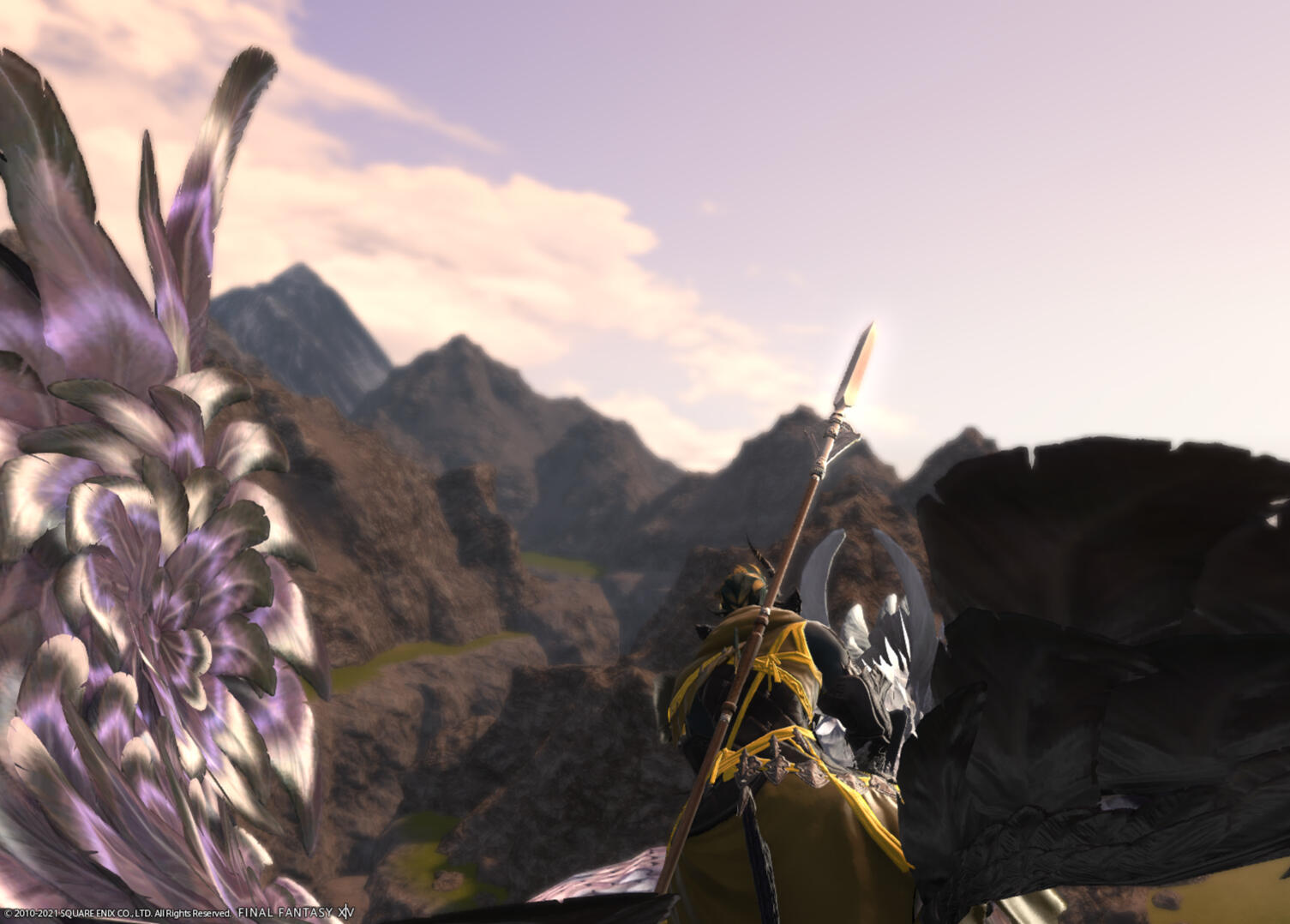 Deep in the mountains north of Azim Steppe is a valley where the Shuvuu reside, their lands considered blessed due to its volume of yol nests. The great birds are worshiped as the totem animal of the tribe and only those who successfully tame and attune to one of these creatures is considered a warrior. From then on the xaela shares a bond with the yol that makes soaring the skies second nature to them. There are far more fatal failures than successes, but each warrior is considered part of an elite few and reach the peak of the social ladder within the tribe's hierarchy.This does nothing to temper their arrogance, but it also fuels their ambition. To a Shuvuu, personal honor is everything and each forever strives to overtake their peers in contest and conquest. If a group is presented a challenge, they will often bid amongst themselves for the right to meet it. For example, if two warriors each seek the right to hunt a great beast, the first could declare they would go without any survival gear. The second either yields, or raises the stakes such as also taking only one arrow. This process of bartering handicaps goes back and forth until one warrior yields. If the winner succeeds they win great honor for themselves, but a defeat brings an even greater loss. These challenges are considered the whetstone that maintains the Shuvuu strength and reputation. A warrior must always press onward, must always seek new ways to break their previously set limits.This practice means that death is common as their bright sparks burn out, and their lifestyle has evolved to embrace every second to enjoy at its fullest. They are performative, dramatic, and embrace the whims of a moment. Rarely does a Shuvuu live beyond 30 years, and those that do often step down to become honored elders that engage in the politics of the Conclave, a governing body composed of various family lines.Whether through trial or flight, the heights Shuvuu aspire to mean they often look down upon their steppe born cousins, believing that the Shuvuu serve a higher purpose in their reverence towards the Duskmother. Few tribes know them as anything more than by the shadow cast by distant wings.Though the Shuvuu are a proud and boastful people, they are not without secrets. Their magical arts are blessed by the predators they worship, granting them a fighting style not unlike the Ishgardian Dragoons. Keen hearing and eyesight is common among the yol-attuned warriors. Someone gifted in aethersight would also be hard pressed not to notice the incorporeal wings on a Shuvuu's back, mirror images of the great steppe birds themselves.